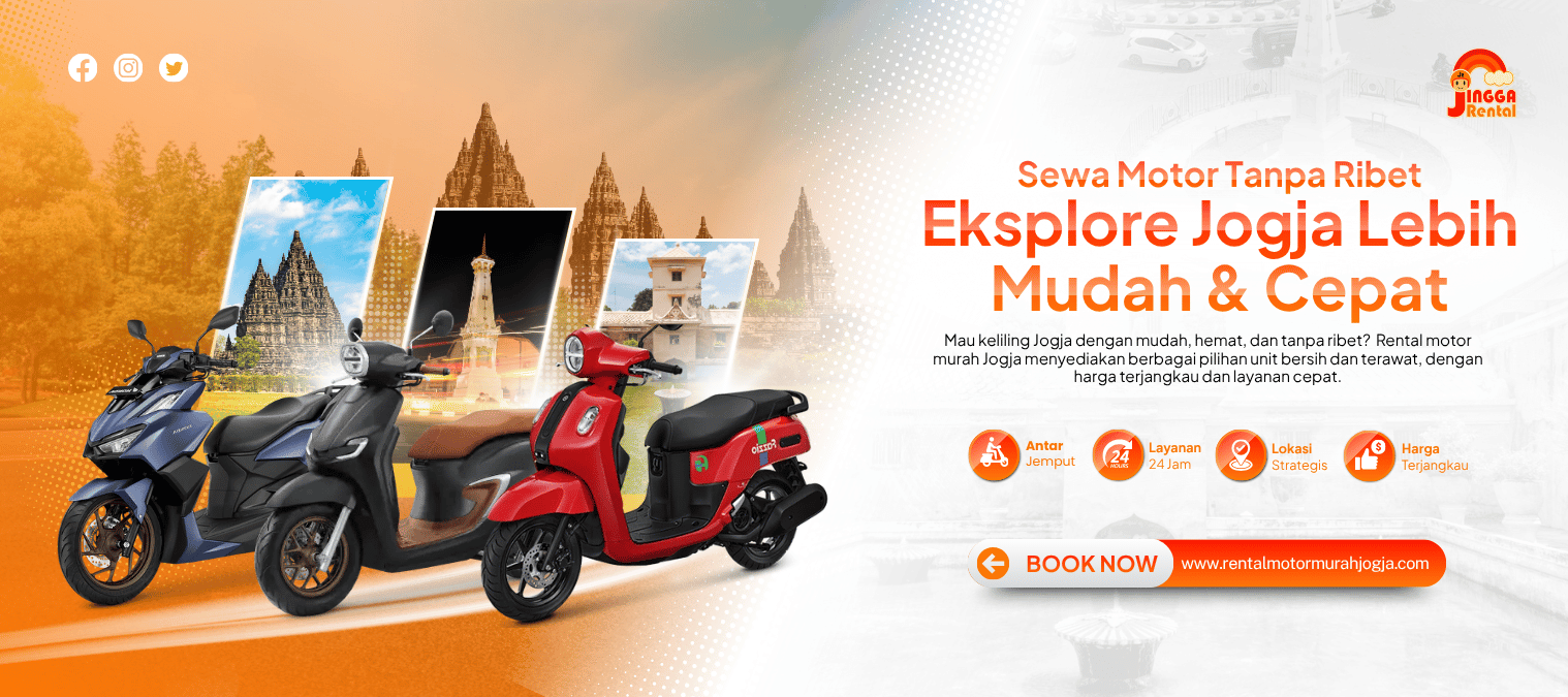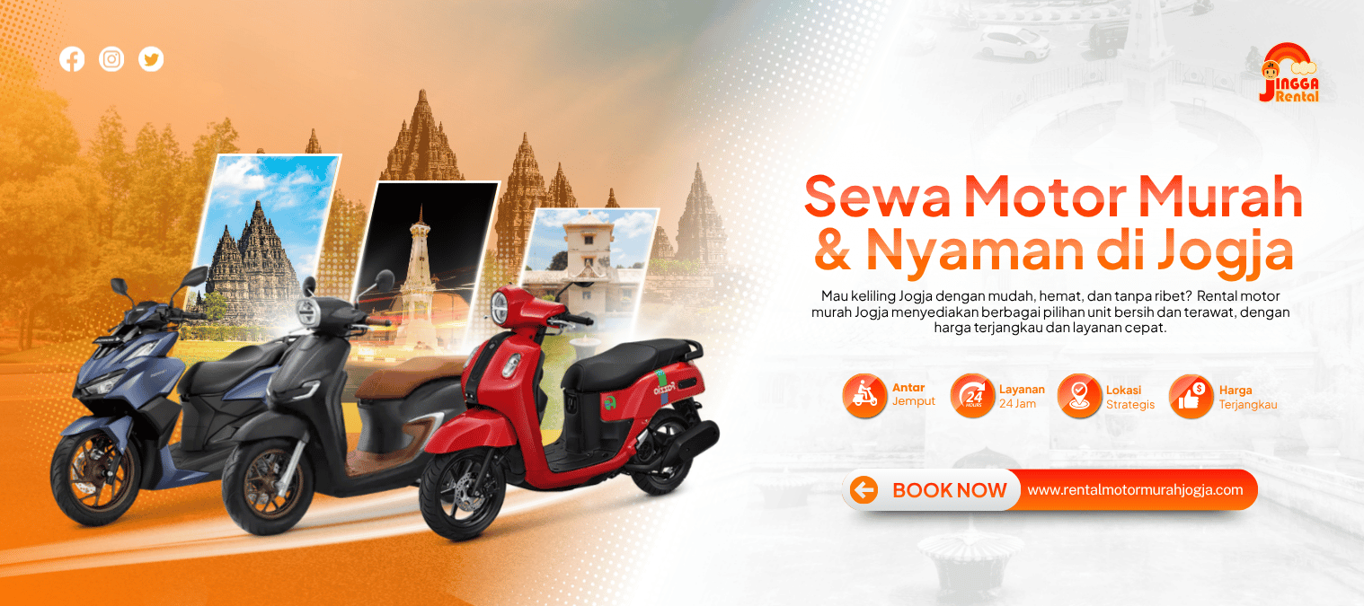 Mau keliling Jogja dengan mudah, hemat, dan tanpa ribet? Rental motor murah Jogja menyediakan berbagai pilihan unit bersih dan terawat, dengan harga terjangkau dan layanan cepat. Tersedia antar–jemput gratis area Kota Jogja untuk memudahkan perjalanan Anda sejak awal.
